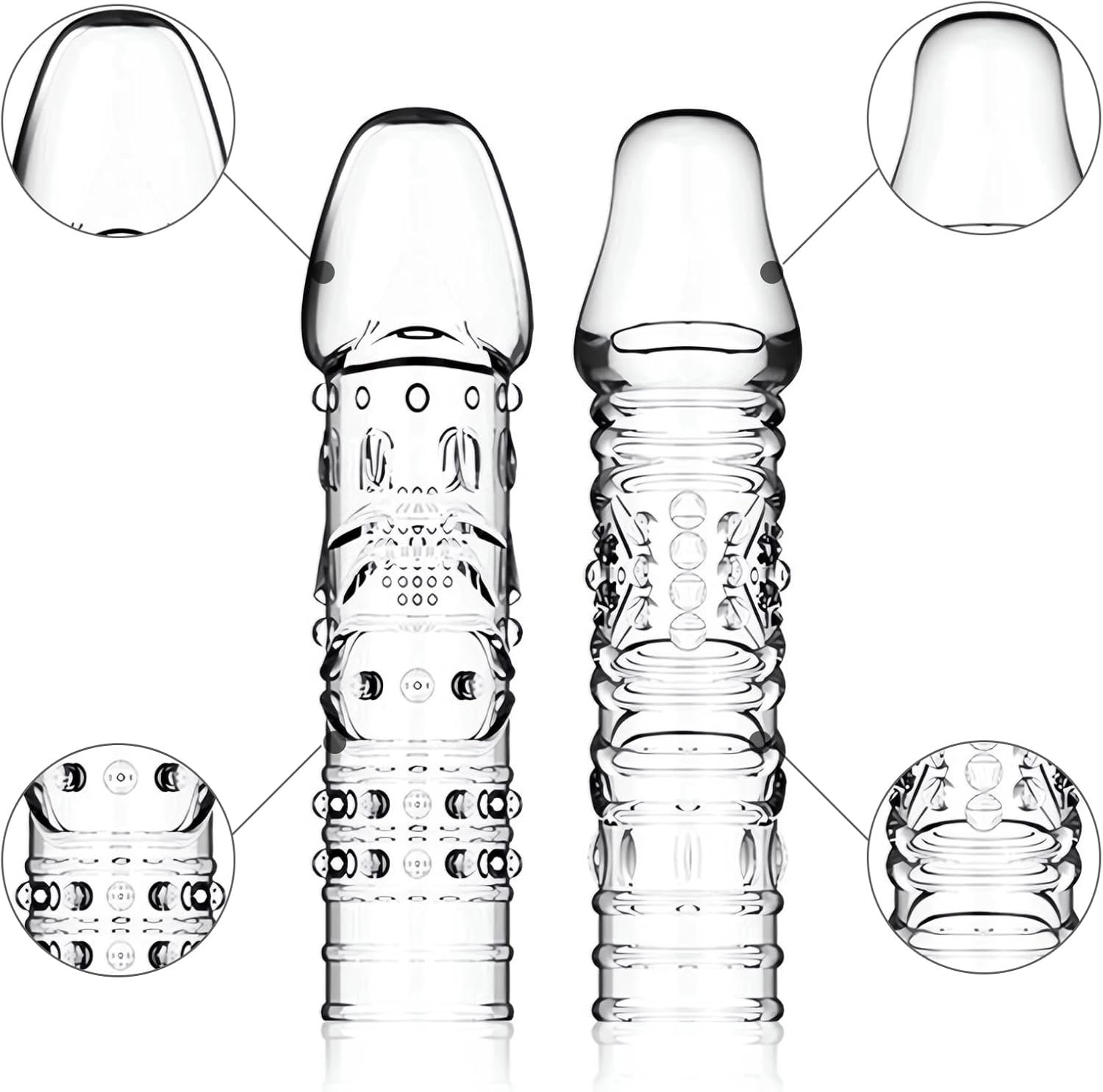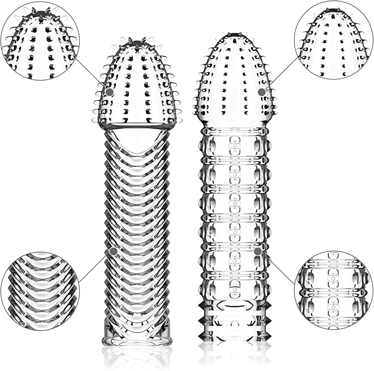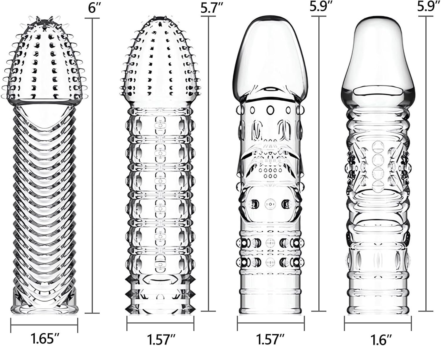 • Diverse Sensual Designs: 4 different shape penis sleeves, each offering unique sensations. From spiraled twists to tantalizing textures, each sleeve introduces a new realm of pleasure, enhancing intimate moments for both you and your partner.